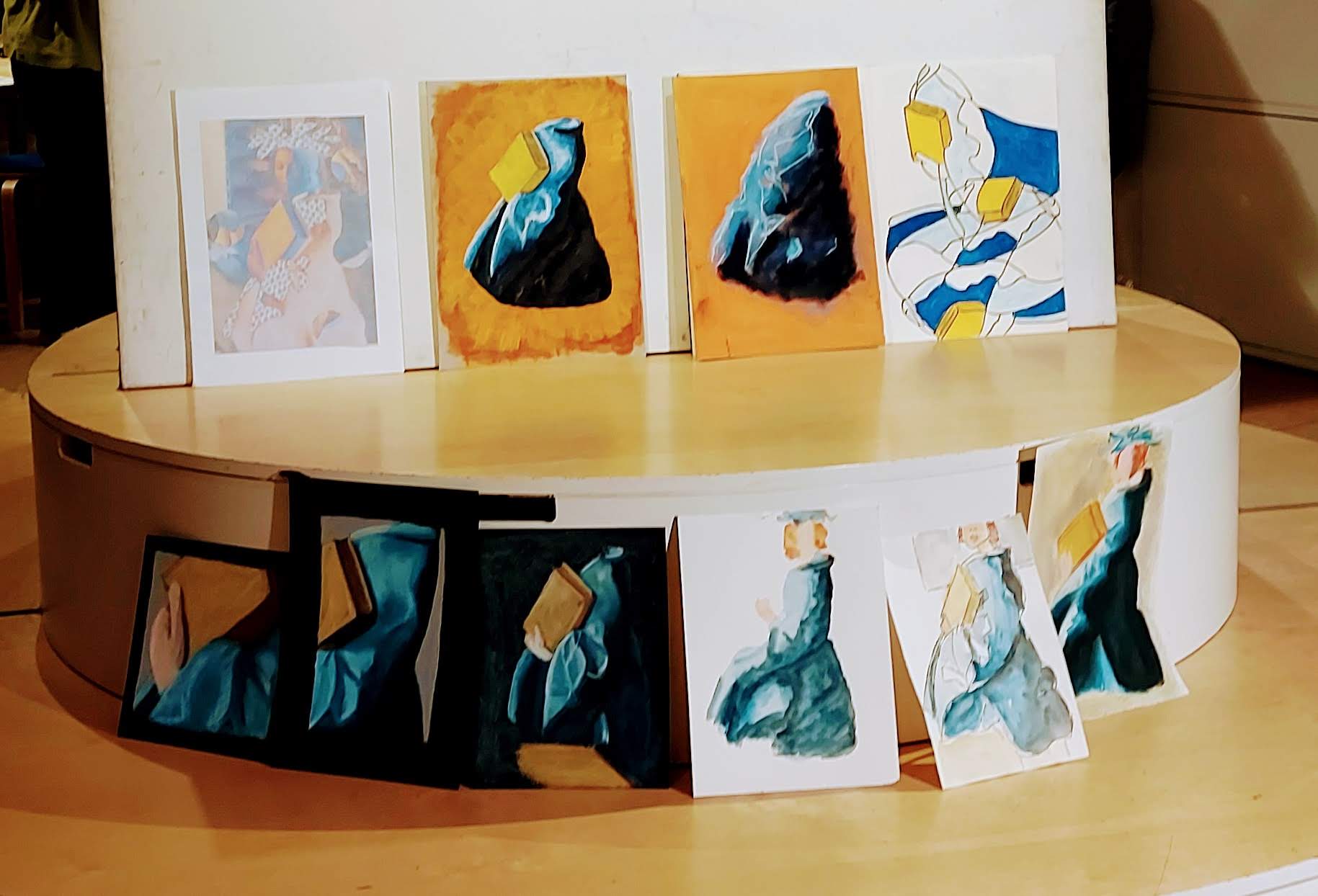 My teacher introduced me to a new technique involving pigments with casein, so I decided to give it a try on my motif. The first attempt used only pigments, the second involved struggling with the technique on an improper background, and the last one stands as one of the most successful outcomes of my “Blue Dress Journey.” By incorporating a vibrant background and layering bright pigments, I managed to create a luminous rendition of the dress.